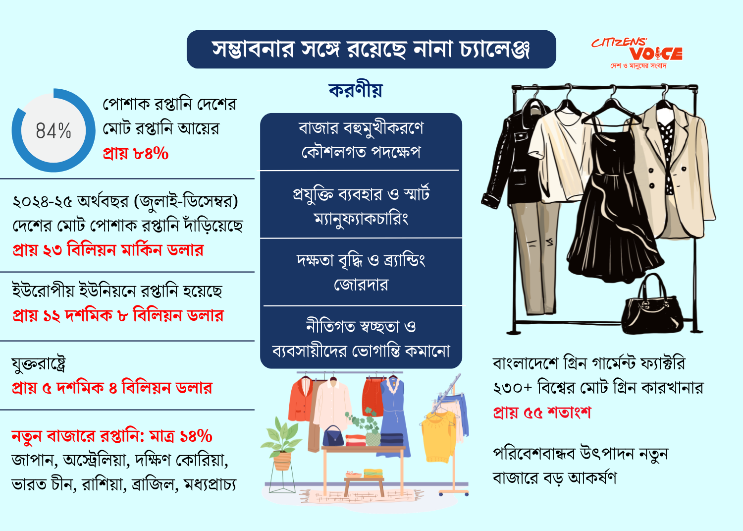 তবে সাফল্যের পেছনে রয়েছে একটি বড় ঝুঁকি। বর্তমানে ইউরোপীয় ইউনিয়ন ও যুক্তরাষ্ট্র মিলিয়ে বাংলাদেশের মোট তৈরি পোশাক রপ্তানির প্রায় ৬৮ থেকে ৭০ শতাংশ যায় এই দুই বাজারে। সীমিত গন্তব্যে এমন নির্ভরতা একদিকে স্থিতিশীল আয় দেয়। অন্যদিকে বৈশ্বিক মন্দা, রাজনৈতিক অস্থিরতা বা নীতিগত পরিবর্তন এলে পুরো খাত ঝুঁকিতে পড়ে।