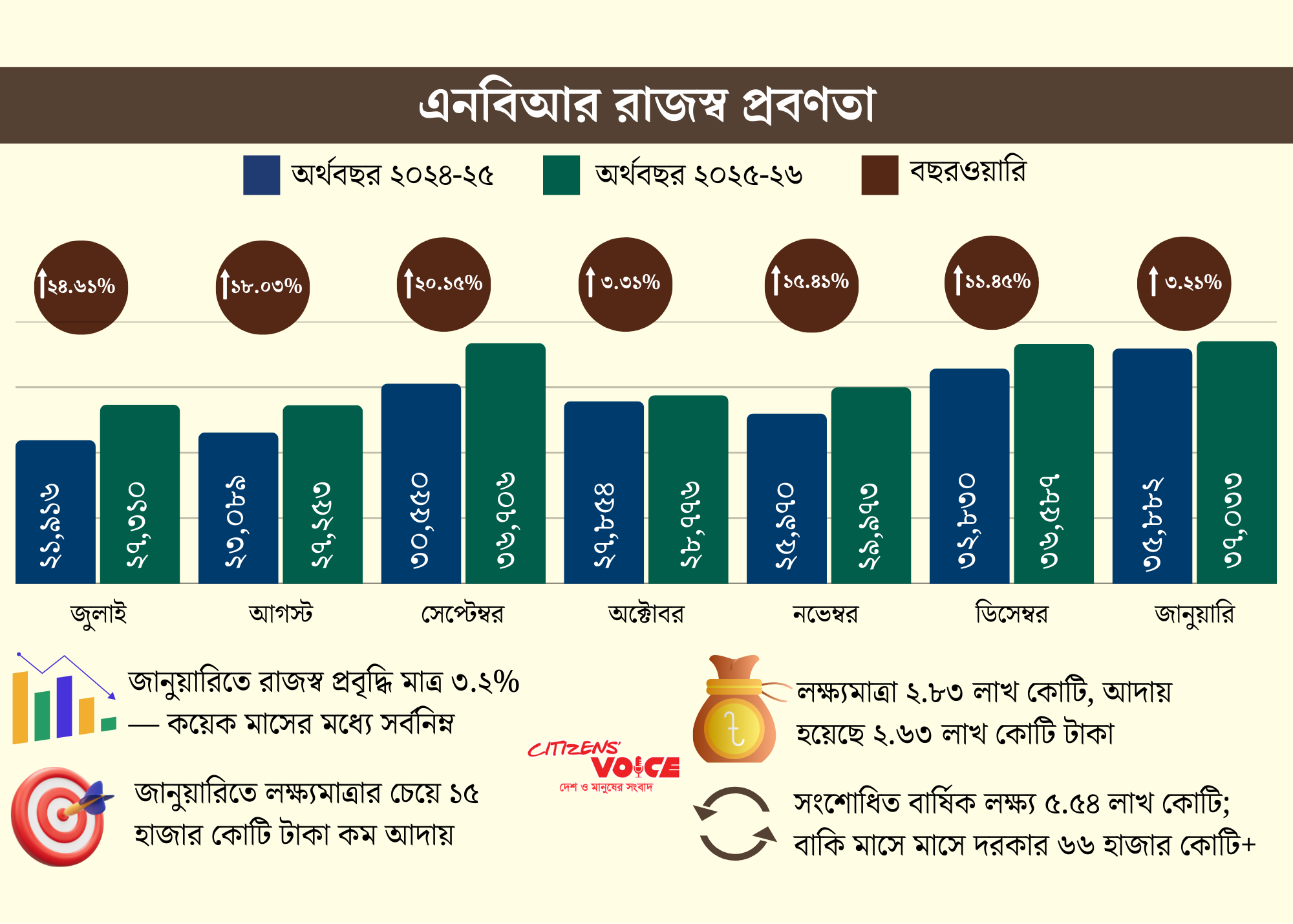 শুল্ক আদায়ে অনিশ্চয়তা এবং অভ্যন্তরীণ চাহিদা কমে আসার কারণে এই মন্থর প্রবৃদ্ধি নতুন সরকারের আর্থিক ব্যবস্থাপনাকে আরও জটিল করে তুলতে পারে। অর্থবছরের শুরুতে রাজস্বের প্রবৃদ্ধি তুলনামূলকভাবে শক্তিশালী ছিল। জুলাই থেকে সেপ্টেম্বরের মধ্যে মাসিক রাজস্ব আদায়ে প্রবৃদ্ধি ছিল ১৮ থেকে ২৫ শতাংশ। অর্থবছরের প্রথমার্ধে দুই অঙ্কের প্রবৃদ্ধি থাকলেও জানুয়ারির এই পতন দেখাচ্ছে, যে আমদানি এবং অভ্যন্তরীণ কর্মকাণ্ডে যে ইতিবাচক গতি ছিল, তা এখন হারাচ্ছে। কেবল জানুয়ারিতেই লক্ষ্যমাত্রার চেয়ে ১৫ হাজার কোটি টাকা কম রাজস্ব আদায় হয়েছে।