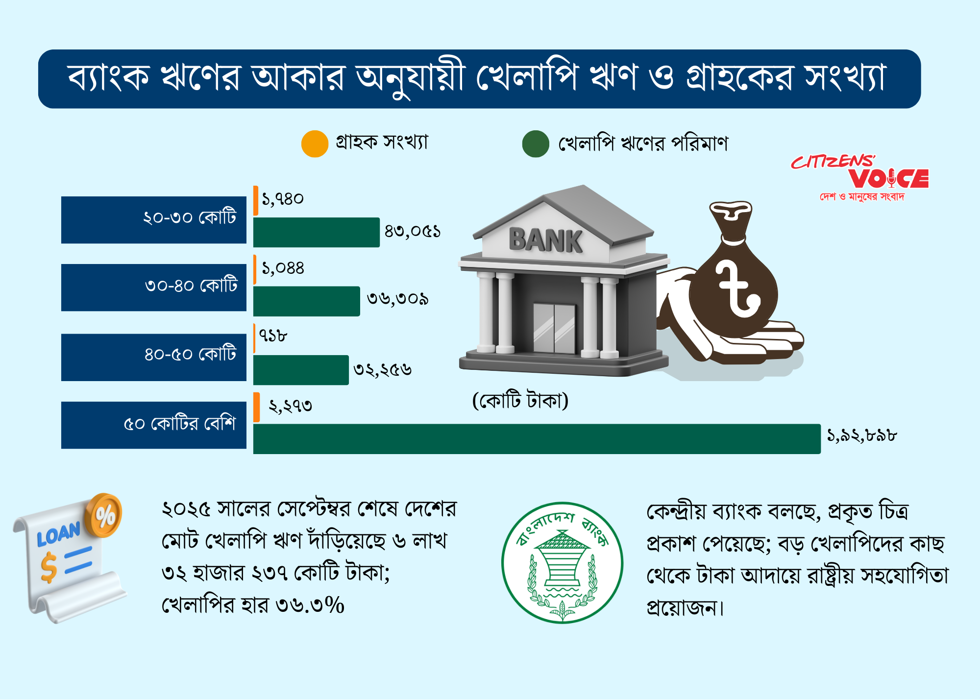 - ৩০–৪০ কোটি টাকার ঋণ নেওয়া ১ হাজার ৪৪ গ্রাহকের খেলাপি ঋণ ৩৬ হাজার ৩০৯ কোটি টাকা,