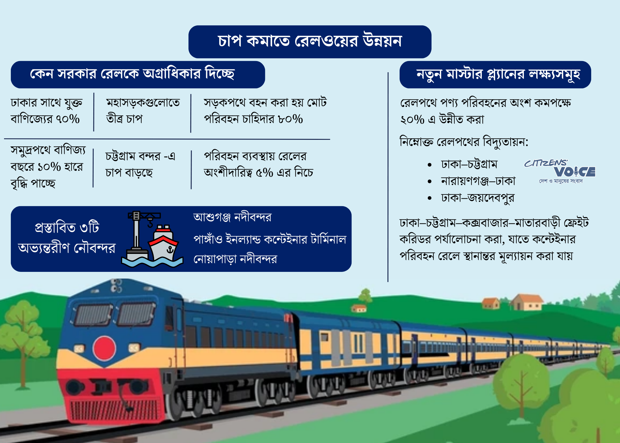 বর্তমানে বাংলাদেশের মোট পরিবহন চাহিদার প্রায় ৮০ শতাংশই সড়কপথের ওপর নির্ভরশীল। এর ফলে সড়কের দ্রুত ক্ষয়, নিরাপত্তা ঝুঁকি এবং জমি অধিগ্রহণের জটিলতা বাড়ছে। এই চ্যালেঞ্জ মোকাবিলায় পরিকল্পনা কমিশন রেলওয়ে খাতকে অগ্রাধিকার দিয়ে একটি বহুমুখী (মাল্টি-মোডাল) পরিবহন রোডম্যাপ চূড়ান্ত করতে যাচ্ছে।