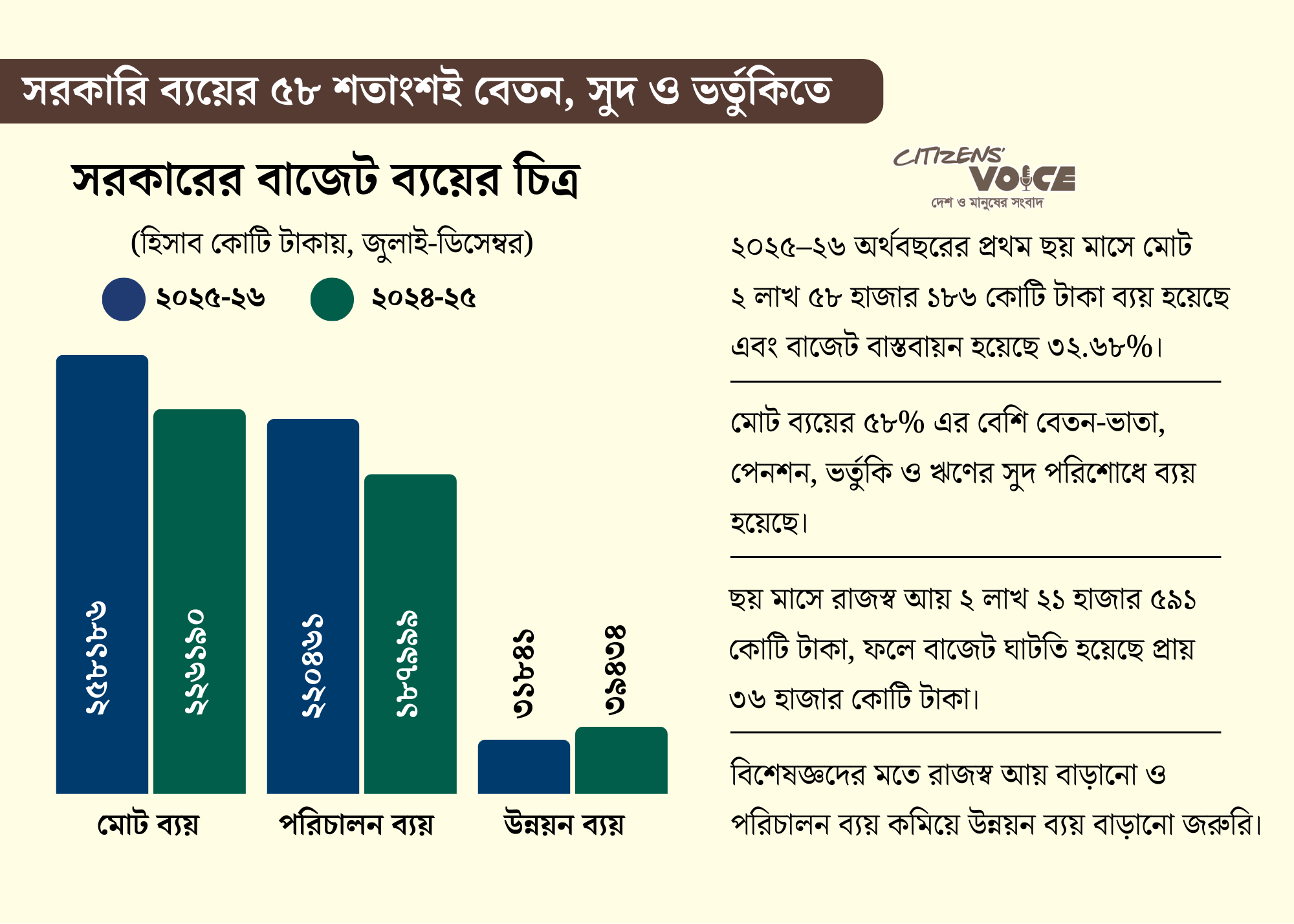 চলতি ২০২৫-২৬ অর্থবছরের প্রথম ছয় মাসে (জুলাই-ডিসেম্বর) সরকার পরিচালন ও উন্নয়ন খাত মিলিয়ে মোট ব্যয় করেছে দুই লাখ ৫৮ হাজার ১৮৬ কোটি টাকা। এ থেকে কর্মকর্তা-কর্মচারীদের বেতন-ভাতা, অবসরপ্রাপ্তদের পেনশন, বিভিন্ন ভর্তুকি এবং ঋণের সুদ পরিশোধে খরচ হয়েছে এক লাখ ৫০ হাজার ৫৩৬ কোটি টাকা। অর্থাৎ মোট ব্যয়ের প্রায় ৫৮ শতাংশ।