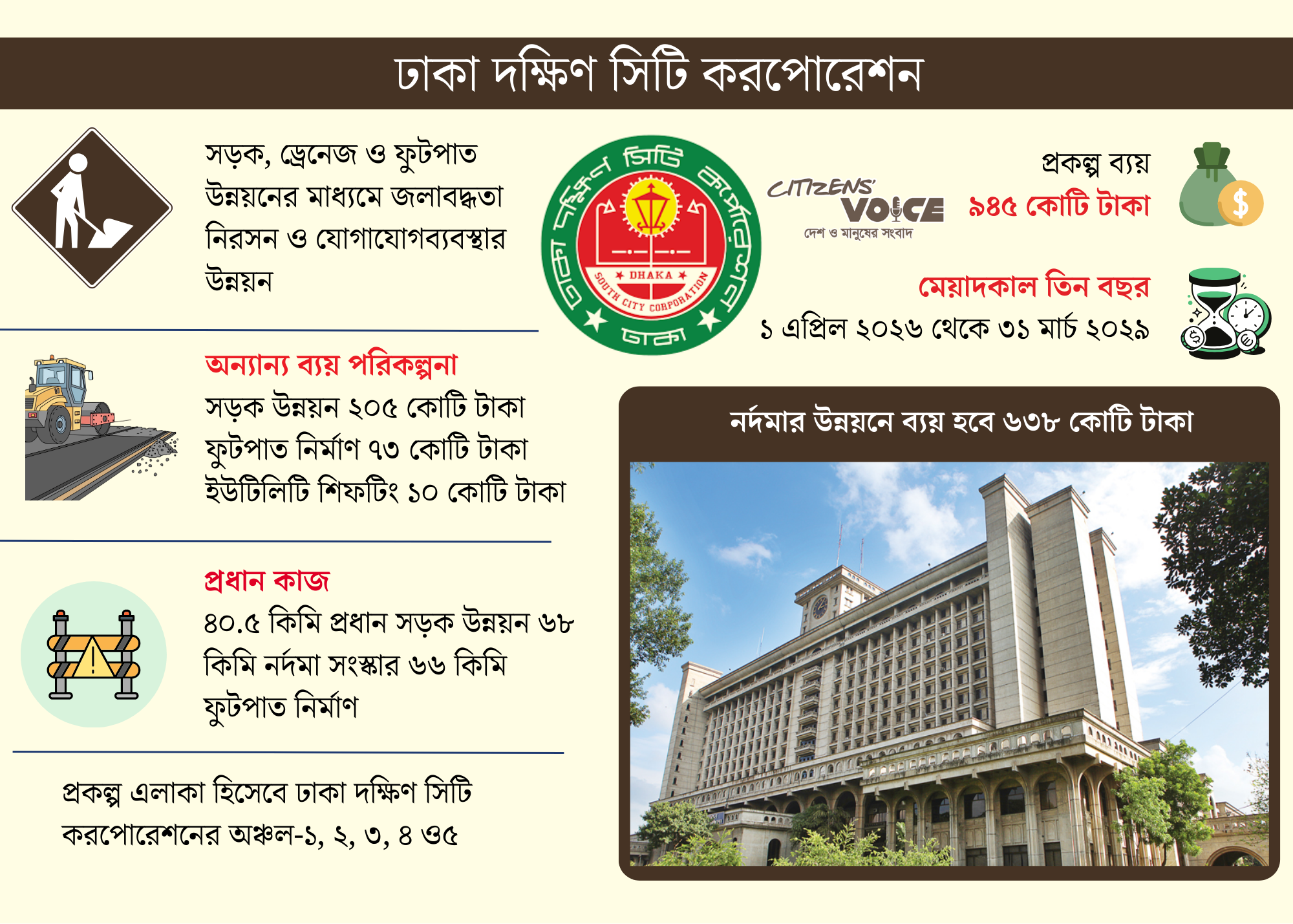 প্রকল্প এলাকা নির্ধারণ করা হয়েছে ডিএসসিসির অঞ্চল-১ থেকে ৫ পর্যন্ত। এর আওতায় থাকবে ধানমন্ডি, নিউ মার্কেট, শাহবাগ, রমনা, পল্টন, শাহজাহানপুর, লালবাগ, বংশাল, যাত্রাবাড়ী ও মতিঝিল থানা এলাকা। কাজের পরিধি অনুযায়ী প্রায় সাড়ে ৪০ কিলোমিটার প্রধান সড়ক, ৬৮ কিলোমিটার নর্দমা এবং ৬৬ কিলোমিটার ফুটপাত উন্নয়ন করা হবে। ব্যয়ের বড় অংশ যাবে ড্রেনেজ ব্যবস্থায়। নর্দমা উন্নয়নে ধরা হয়েছে ৬৩৮ কোটি টাকা। সড়ক উন্নয়নে ২০৫ কোটি এবং ফুটপাত নির্মাণে ৭৩ কোটি টাকা ব্যয় করা হবে। ইউটিলিটি লাইন ও তার সরাতে থোক বরাদ্দ রাখা হয়েছে ১০ কোটি টাকা। কর্মকর্তাদের সম্মানী ভাতা ১০ লাখ, প্রচার ও বিজ্ঞাপনে ৫ লাখ এবং স্টেশনারি খাতে ৫ লাখ টাকা ধরা হয়েছে। সব মিলিয়ে প্রকল্প ব্যয় দাঁড়িয়েছে ৯৪৫ কোটি ৫৪ লাখ টাকা।
