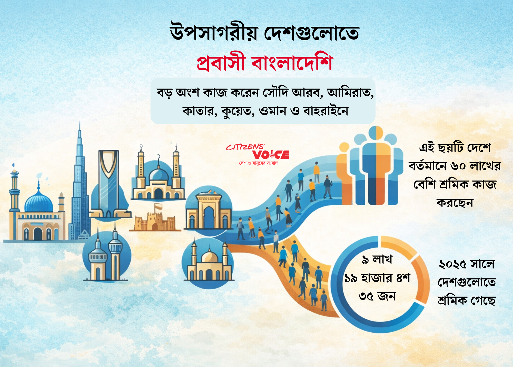 বাংলাদেশের প্রবাসী শ্রমিকদের বড় অংশ কাজ করেন সৌদি আরব, সংযুক্ত আরব আমিরাত, কাতার, কুয়েত, ওমান ও বাহরাইনে। এই ছয়টি দেশেই যুক্তরাষ্ট্রের ঘাঁটি রয়েছে। ২০২৫ সালে এই দেশগুলোতে প্রেরিত শ্রমিকের সংখ্যা ছিল ৯ লাখ ১৯ হাজার ৪৩৫। বিএমইটির তথ্য অনুযায়ী, বর্তমানে এই ছয়টি দেশে ৬০ লাখের বেশি বাংলাদেশি শ্রমিক কাজ করছেন।