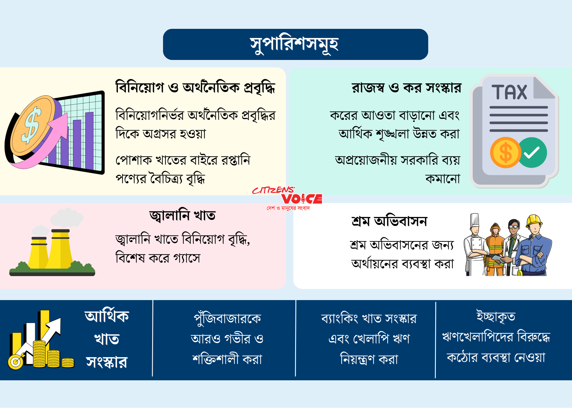 বাংলাদেশে বর্ধিত কর্মসংস্থান সৃষ্টির জন্য বিনিয়োগ বাড়ানো, শক্তি সরবরাহ নিশ্চিত করা এবং বেসরকারি খাতকে সমর্থন দেওয়াই এখন অগ্রাধিকার হওয়া উচিত। এমন মন্তব্য করেছেন অর্থনীতিবিদ ও ব্যবসায়ী নেতারা। তারা সতর্ক করেছেন, দেশের ব্যাংকিং খাত এখনও দুর্বল। অযোগ্য ঋণ বৃদ্ধি ও ক্রেডিট প্রবৃদ্ধির ধীরগতি ব্যাংকিং ব্যবস্থাকে ঝুঁকির মধ্যে রাখছে।