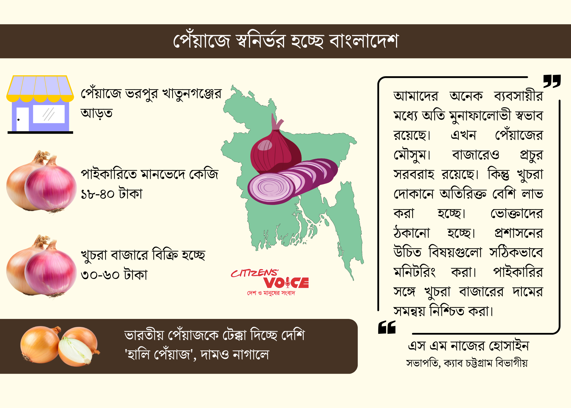 খাতুনগঞ্জ ও চাক্তাইয়ের আড়তদার ব্যবসায়ীরা জানান, বর্তমানে দেশি হালি জাতের পেঁয়াজ মানের দিক থেকে ভারতীয় ভালো মানের পেঁয়াজকেও টেক্কা দিচ্ছে। তাদের মতে, এই সময়ে পেঁয়াজ চাষিদের সহায়তায় সরকারের উদ্যোগ বাড়ানো প্রয়োজন।
