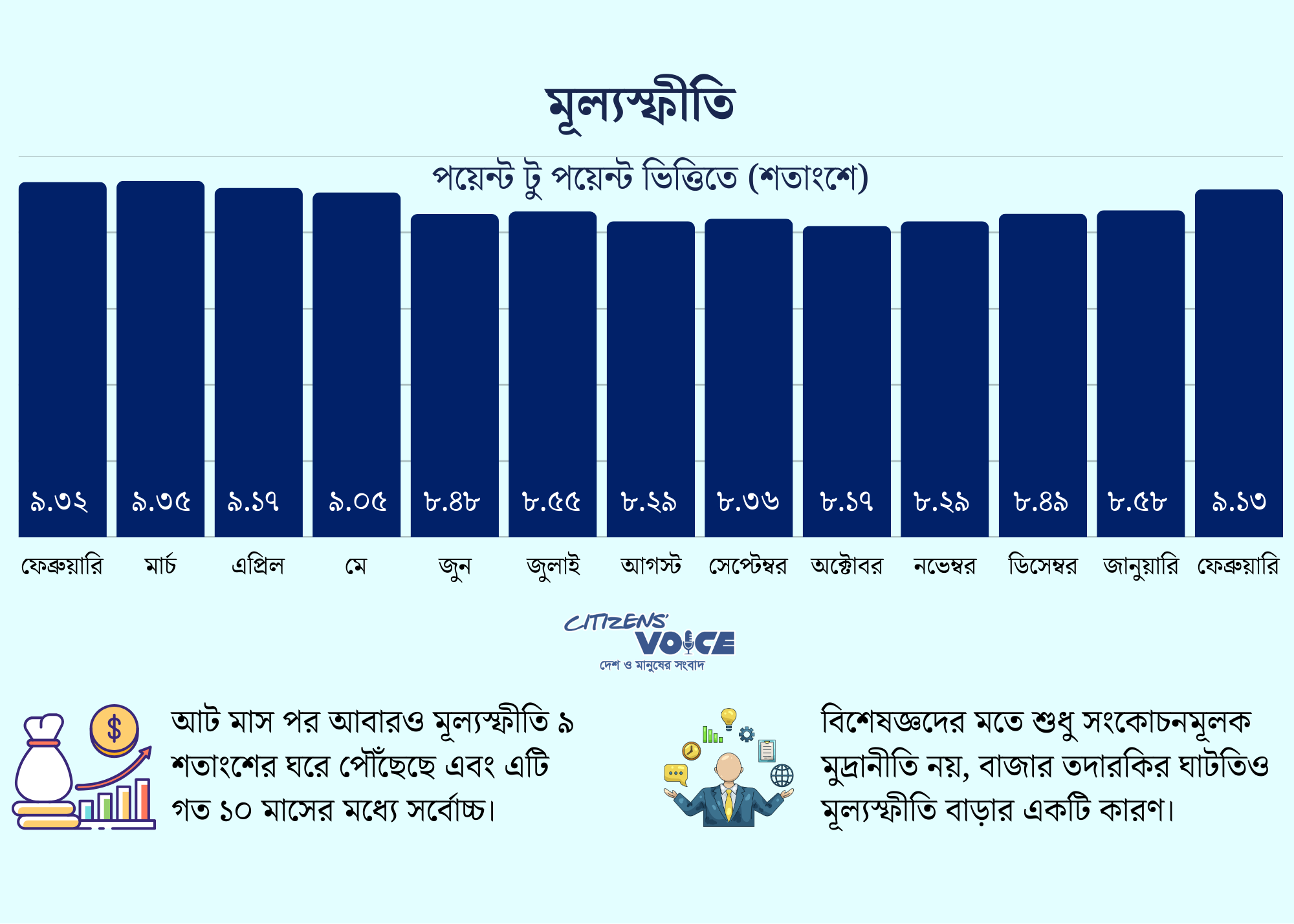 গত আট মাসের বিরতির পর আবারও ৯ শতাংশের ঘরে পৌঁছেছে বাংলাদেশের মূল্যস্ফীতি। বাংলাদেশ পরিসংখ্যান ব্যুরো (বিবিএস) সম্প্রতি প্রকাশিত ভোক্তা মূল্যসূচক (সিপিআই) অনুযায়ী ফেব্রুয়ারি মাসে পয়েন্ট টু পয়েন্ট ভিত্তিতে মূল্যস্ফীতি হয়েছে ৯.১৩ শতাংশ। এর আগে গত বছরের মে মাসে ৯ শতাংশের ওপরে মূল্যস্ফীতি রেকর্ড হয়।