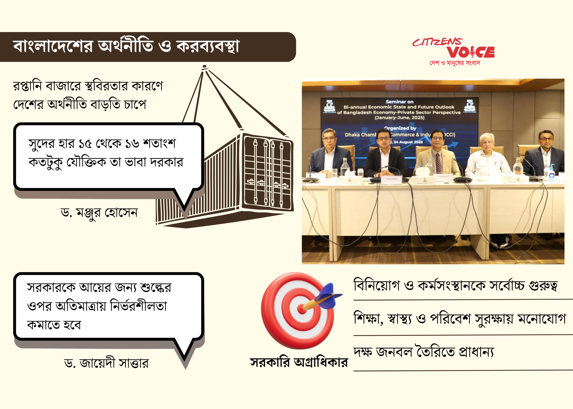 ডিসিসিআই সভাপতি তাসকীন আহমেদ বলেন, “মধ্যপ্রাচ্যের সংঘাত, যুক্তরাষ্ট্র ও ইসরায়েলের নীতিমালার কারণে বৈশ্বিক বাণিজ্যে ঝুঁকি বেড়েছে। দেশের শিল্পখাতে ব্যবহৃত জ্বালানি মূলত আমদানিনির্ভর হওয়ায় বেসরকারি খাতে অস্থিরতা দেখা দিচ্ছে। মার্কিন প্রশাসনের নতুন ১০ শতাংশ শুল্কনীতি স্থানীয় ও আন্তর্জাতিক বাণিজ্য ও বিনিয়োগে নেতিবাচক প্রভাব ফেলতে পারে। পরিস্থিতি বিবেচনা করে এলডিসি উত্তরণ তিন বছর পিছিয়ে দেওয়া, বাণিজ্য প্রক্রিয়া সহজ করা এবং রপ্তানি বহুমুখীকরণের মাধ্যমে বৈশ্বিক প্রতিযোগিতায় টিকে থাকা জরুরি। একই সঙ্গে রাজস্ব ব্যবস্থায় অটোমেশন, প্রত্যক্ষ করের আওতা বৃদ্ধি, সরকারের ঋণ গ্রহণের প্রবণতা কমানো এবং সরকারি ব্যয়ের দক্ষতা বাড়ানোও অত্যাবশ্যক।”