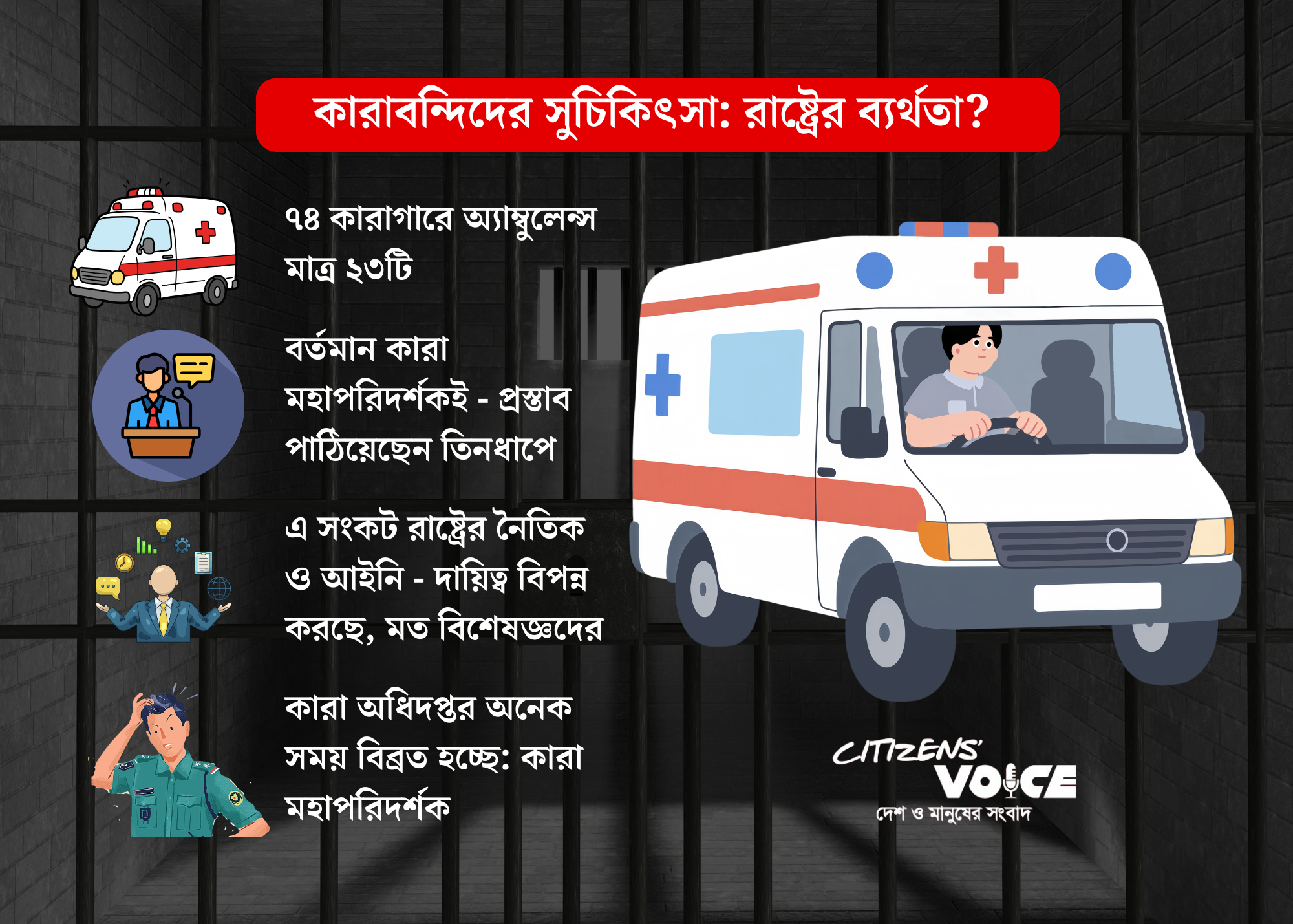 কারাগারে বন্দিদের পূর্ণাঙ্গ ও সুচিকিৎসা নিশ্চিত করা রাষ্ট্রের সাংবিধানিক ও আইনি দায়িত্ব। তবে বর্তমানে দেশের কারাগারগুলোতে পর্যাপ্ত অ্যাম্বুলেন্স না থাকা একটি গুরুতর উদ্বেগের বিষয়।