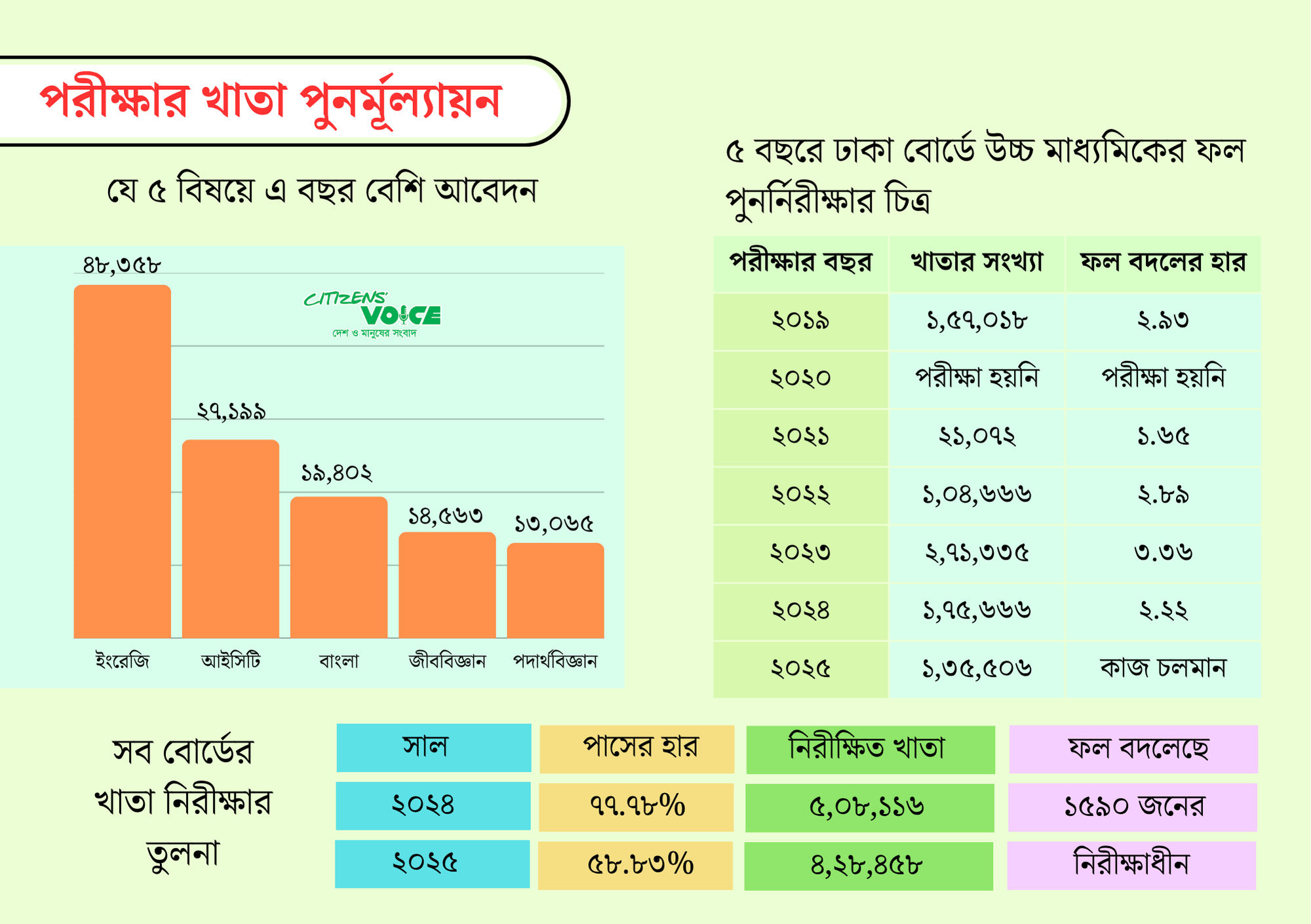 চলতি বছর এইচএসসি ও সমমান পরীক্ষায় ১১টি বোর্ডে গড় পাসের হার ৫৮ দশমিক ৮৩ শতাংশ, যা গত দুই দশকের মধ্যে সর্বনিম্ন। অনুত্তীর্ণ হয়েছেন পাঁচ লাখ আট হাজার ৭০১ শিক্ষার্থী। তবুও খাতা চ্যালেঞ্জের আবেদন এসেছে তুলনামূলক কম—দুই লাখ ২৬ হাজার ৫৬১ শিক্ষার্থী মিলে চার লাখ ২৮ হাজার ৪৫৮ খাতা পুনর্নিরীক্ষার আবেদন করেছেন। ইংরেজি ও আইসিটি বিষয়েই এসেছে সবচেয়ে বেশি আবেদন।