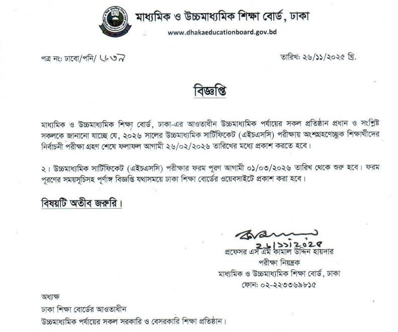 বিজ্ঞপ্তিতে বলা হয়েছে, ২০২৬ সালের এইচএসসি এবং সমমানের নির্বাচনী পরীক্ষার ফল আগামী ২৬ ফেব্রুয়ারির মধ্যে প্রকাশ করতে হবে। এইচএসসি পরীক্ষার ফরম পূরণের কার্যক্রম ১ মার্চ থেকে শুরু হবে।