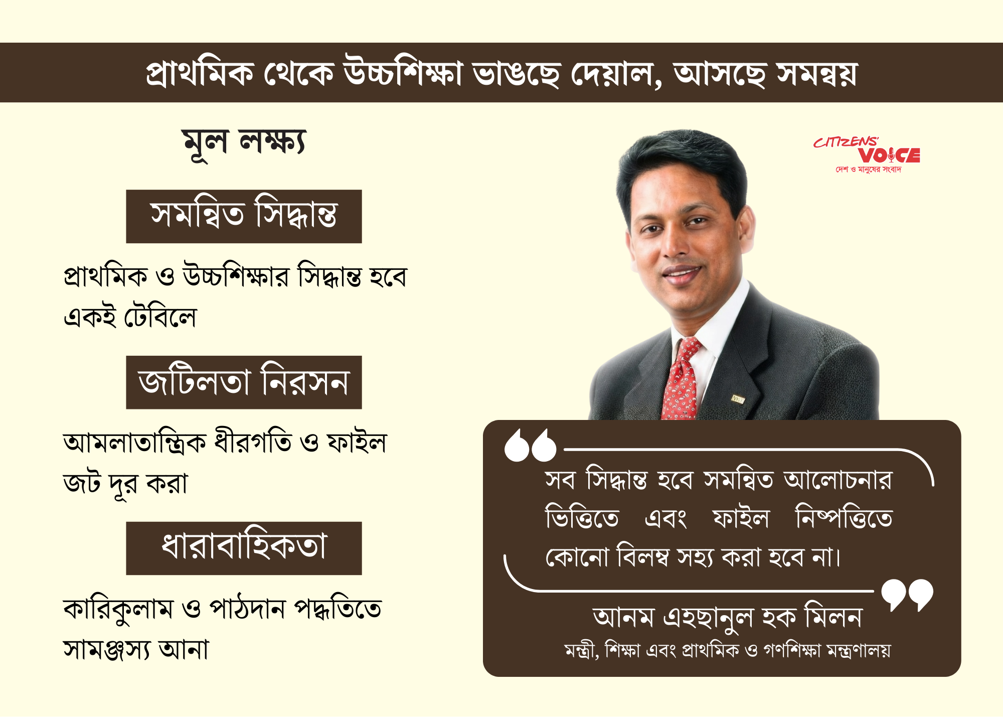 এই পদক্ষেপ শুধু প্রশাসনিক সংস্কার নয়, বরং একটি দীর্ঘমেয়াদি শিক্ষামিশনের অংশ। একই নেতৃত্বের অধীনে প্রাথমিক থেকে উচ্চশিক্ষা পরিচালিত হলে গ্রামীণ-শহুরে বৈষম্য কমানো, প্রযুক্তিনির্ভর কারিকুলাম বাস্তবায়ন এবং মানসম্মত শিক্ষা নিশ্চিত করা সহজ হতে পারে।