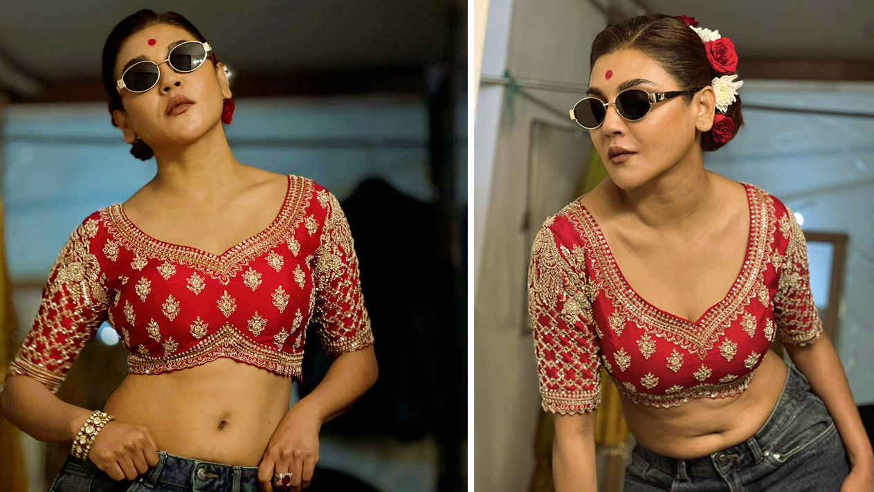 এই ছবিগুলোতে তার ফ্যাশন স্টেটমেন্ট ছিল একেবারেই ভিন্ন। পরনে দেখা যায় পাথরের জমকালো কাজ করা লাল রঙের ব্লাউজ, যার সঙ্গে পরেছেন ধূসর রঙের জিন্স। ঐতিহ্য আর আধুনিকতার এই ফিউশন লুকে জয়া নজর কেড়েছেন সবার।