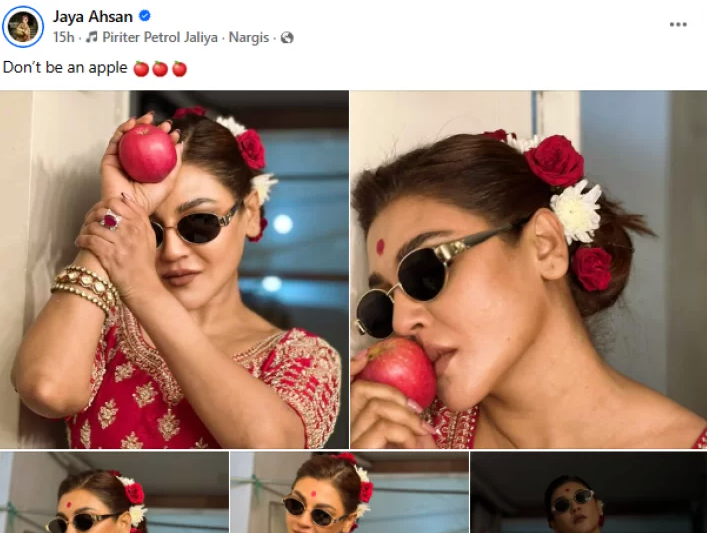 নায়িকা সেই আপেল নিয়ে নানা ভঙ্গিতে পোজ দিয়েছেন। কখনও আপেল হাতে ধরে, আবার কখনও মাথায় ব্যালেন্স করে, এমনকি কখনও ঠোঁটের কাছে ঠেকিয়ে ছবি তুলেছেন। এই ছবিগুলো পোস্ট করে জয়া ক্যাপশনে লিখেছেন, ‘আপেল হয়ো না।’