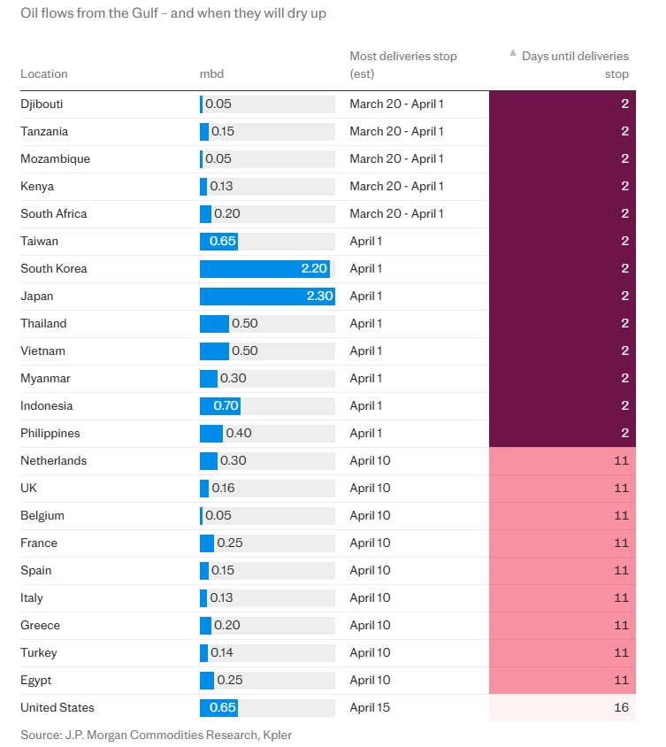 যুদ্ধের প্রভাবে সবচেয়ে ক্ষতিগ্রস্ত হবে সেসব দেশ, যারা গালফ অঞ্চলের উপর বেশি নির্ভরশীল। উদাহরণস্বরূপ, ফিলিপাইন, যেটি গালফের ৯৮% তেল আমদানি করে, সেখানে ডিজেল এবং পেট্রোলের দাম দ্বিগুণ হয়ে গেছে, এবং সরকার সেখানে শক্তি সংকটের মোকাবিলা করতে পদক্ষেপ গ্রহণ করেছে। ফিলিপাইন সরকার চাকরিজীবীদের জন্য চারদিনের সপ্তাহ ঘোষণা করেছে এবং ট্যাক্সি ড্রাইভারদের জন্য সাবসিডি ঘোষণা করেছে। অন্যদিকে, ভারত, পাকিস্তান, বাংলাদেশ এবং শ্রীলঙ্কায় জ্বালানির দাম বেড়ে যাওয়ায় স্কুল বন্ধ হচ্ছে, রেশনিং চলছে এবং শিল্প উৎপাদন সীমিত করা হচ্ছে।