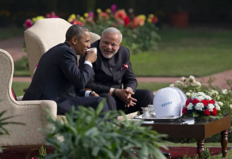 যুক্তরাষ্ট্রের প্রেসিডেন্ট ব্যারাক ওবামা (বাম) এবং ভারতের প্রধানমন্ত্রী নরেন্দ্র মোদি ২৫ জানুয়ারি, ২০১৫ সালে ভারতের নয়াদিল্লীর হায়দরাবাদ হাউসের বাগানে কফি ও চা উপভোগ করছেন।