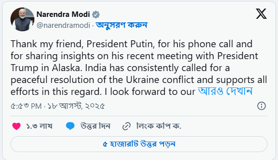 মোদি এক্সে দেওয়া বার্তায় এ তথ্য নিশ্চিত করে জানান, যুদ্ধে রাশিয়ার অবস্থান স্পষ্ট করার জন্য তিনি পুতিনকে ধন্যবাদ জানিয়েছেন। তিনি লেখেন, “আমার বন্ধু প্রেসিডেন্ট পুতিন আজ আমাকে ফোন করেছিলেন। আলাস্কায় প্রেসিডেন্ট ট্রাম্পের সঙ্গে তার সাম্প্রতিক বৈঠক সম্পর্কিত নানা তথ্য ও অভিজ্ঞতা তিনি আমার সঙ্গে শেয়ার করেছেন। ভারত সব সময় শান্তিপূর্ণভাবে সংঘাত নিরসনের পক্ষে এবং শুরু থেকেই উভয় পক্ষকে এই আহ্বান জানিয়ে আসছে। সামনের দিনগুলোতেও বিভিন্ন ইস্যুতে মতবিনিময়ের জন্য আমি অপেক্ষা করছি।”