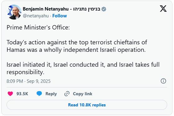 হামলার পর ইসরায়েলি নেতৃত্ব অনুতাপের কোনো লক্ষণ দেখায়নি। প্রধানমন্ত্রী বেনিয়ামিন নেতানিয়াহু সোজাসাপ্টা বলেছেন, “হামলা ইসরায়েল শুরু করেছে, ইসরায়েল পরিচালনা করেছে, এবং তার সম্পূর্ণ দায়ভার ইসরায়েল নিচ্ছে।”