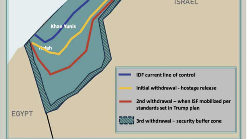 ১৬. ইসরায়েল গাজা দখল বা একীভূত করবে না। আইএসএফ স্থিতিশীলতা প্রতিষ্ঠা করলে ইসরায়েল প্রতিরক্ষা বাহিনী (আইডিএফ) চুক্তি মোতাবেক প্রত্যাহার করা হবে।