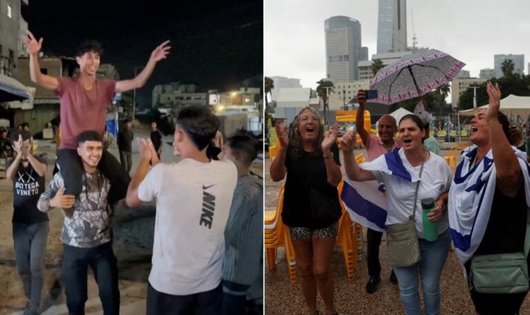ইসরায়েলের রাস্তায় আনন্দ উদযাপনের দৃশ্য লক্ষ্য করা গেছে। দুই বছর ধরে বন্দি প্রিয়জনদের প্রত্যাবর্তনের জন্য অপেক্ষা করা পরিবারগুলো একে অপরকে জড়িয়ে ধরছেন, চোখে জল, শ্যাম্পেনের উচ্ছ্বাস। এক ইসরায়েলি মা বলেন, “মাতান বাড়ি ফিরছে। এ সেই অশ্রু, যার জন্য আমি প্রার্থনা করেছি।”