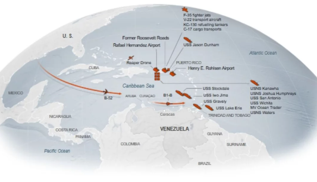 রয়টার্সের তথ্যমতে, গত অগাস্ট থেকে যুক্তরাষ্ট্র ক্যারিবীয় অঞ্চলে অন্তত ১৩টি যুদ্ধজাহাজ, পাঁচটি সহায়ক জাহাজ ও একটি পারমাণবিক সাবমেরিন মোতায়েন করেছে। এর মধ্যে রয়েছে বিশাল বিমানবাহী রণতরী ‘জেরাল্ড আর. ফোর্ড’, যা প্রায় ১০ হাজার সৈন্য ও ৭৫টিরও বেশি যুদ্ধবিমান বহন করতে পারে।