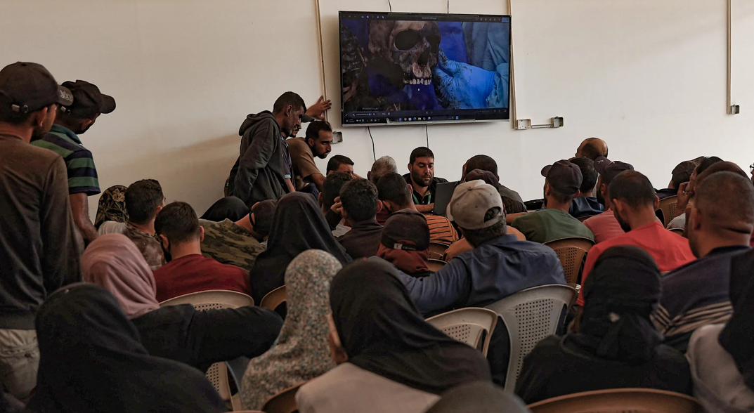 সাদা রঙের দেয়াল ঘেরা একটি ছোট হলঘরে ডজনখানেক মা ও স্ত্রী চুপচাপ বসে আছেন সামনের সারিতে। পেছনের দিকে দাঁড়িয়ে আছেন বাবা, ভাই ও বন্ধুরা। সবার দৃষ্টি খান ইউনিসের নাসের মেডিকেল কমপ্লেক্সের স্ক্রিনে, যেখানে দেখানো হচ্ছে পচে-গেলে যাওয়া মরদেহের ছবি। এসব দেহাবশেষের মধ্যে হয়তো তাদের প্রিয়জনও আছেন।