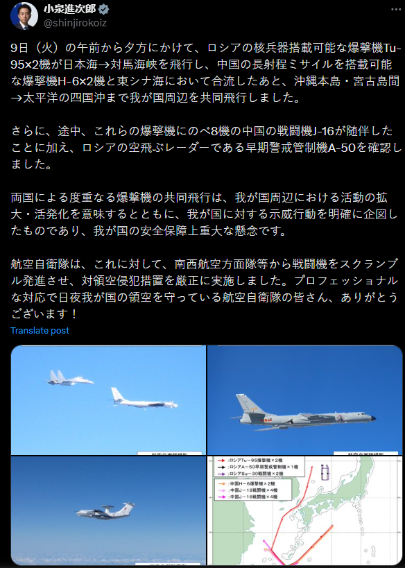 জাপানের প্রতিরক্ষামন্ত্রী শিনজিরো কোইজুমি বলেছেন, ‘রাশিয়া ও চীনের যৌথ টহলের খবরের পর সম্ভাব্য আকাশসীমা লঙ্ঘনের বিরুদ্ধে এয়ার ডিফেন্স ব্যবস্থা কঠোরভাবে বাস্তবায়নের জন্য জাপান পৃথকভাবে সামরিক বিমান মোতায়েন করেছে।’