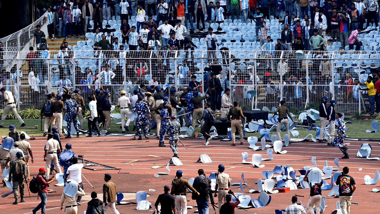 এদিকে লিওনেল মেসি সময়ের আগে স্টেডিয়াম ছেড়ে চলে যাওয়ায় মাঠ ও গ্যালারি জুড়ে চরম বিশৃঙ্খলা দেখা দেয়। আসন ভাংচুর করা হয়, টার্ফ নষ্ট করা হয়। মাঠে নেমে আসেন ক্ষুব্ধ দর্শকদের একাংশ।