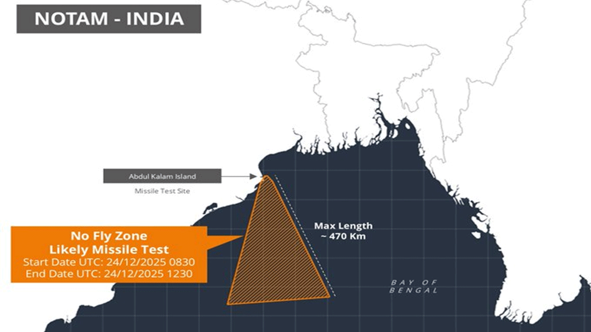 ভারতের পক্ষ থেকে বঙ্গোপসাগরের একটি বিশাল এলাকায় নোটিস টু এয়ারমেন (নোটাম) জারি করা হয়েছে। নোটামটি কার্যকর থাকবে আগামী ২২ ডিসেম্বর ভোর সাড়ে ৪টা থেকে ২৪ ডিসেম্বর সকাল সাড়ে ৮টা পর্যন্ত। এই সময়কালে ওই এলাকার ওপর দিয়ে বিমান চলাচলের ক্ষেত্রে সতর্কতা অবলম্বন করতে বলা হয়েছে।