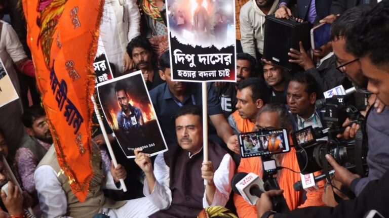 সোমবার (২২ ডিসেম্বর) হাইকমিশনের সামনে উপস্থিত হন শুভেন্দু। তিনি বাংলাদেশের ময়মনসিংহে হিন্দু যুবক দীপু দাস হত্যাকাণ্ডের ঘটনায় বিক্ষোভ করতে গিয়ে উগ্র মন্তব্য করেন।