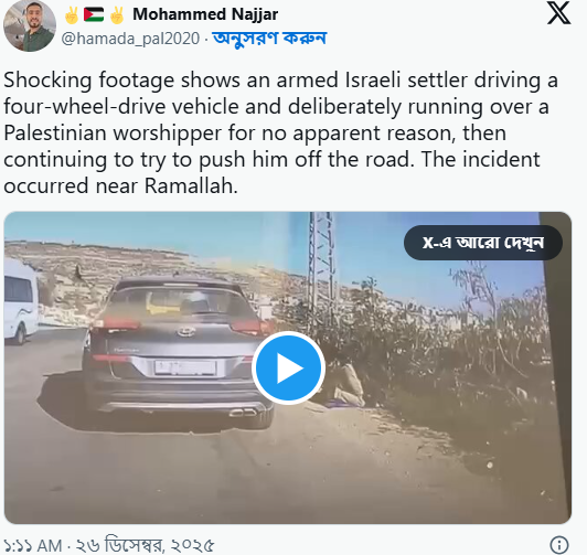 প্যালেস্টিনিয়ান টেলিভিশনে প্রচারিত ওই ভিডিওটি যাচাই করার পর এর সত্যতা নিশ্চিত করেছে বার্তা সংস্থা রয়টার্স। ভিডিওতে দেখা যায়, বেসামরিক পোশাক পরিহিত এক ব্যক্তি কাঁধে ঝুলিয়ে রাখা একটি বন্দুকসহ একটি অফ-রোড যান চালিয়ে রাস্তার পাশে প্রার্থনারত এক ফিলিস্তিনির দিকে দ্রুত এগিয়ে যান এবং গাড়ি দিয়ে তাঁকে সজোরে আঘাত করেন।