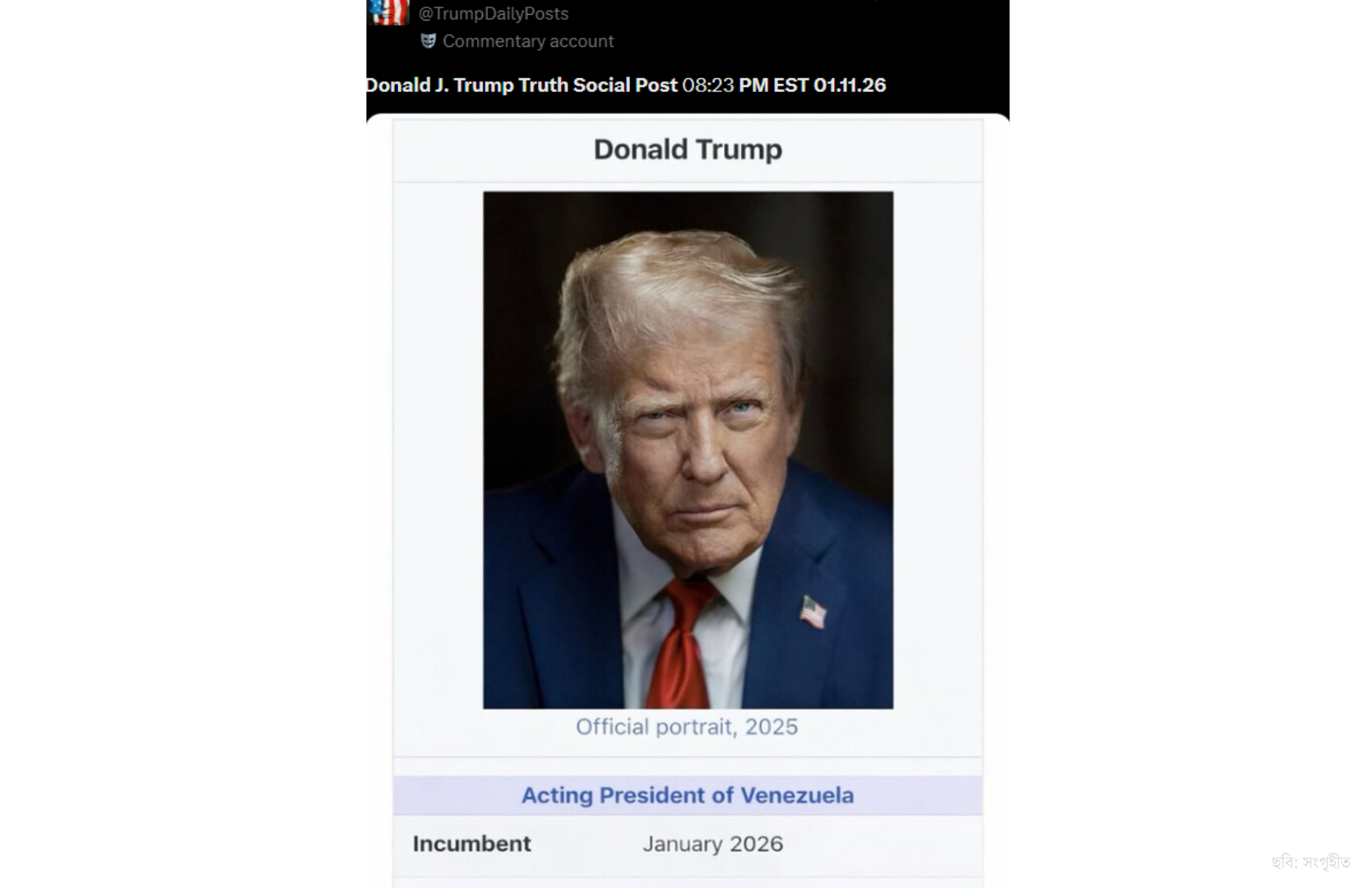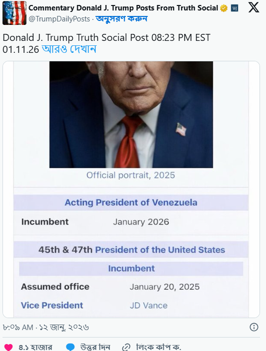 গতকাল রোববার ট্রুথ সোশ্যালে নিজের একটি ছবি পোস্ট করেছেন প্রেসিডেন্ট ট্রাম্প। সেই ছবির নিচে বলা হয়েছে, ২০২৬ সালের জানুয়ারি মাসে ভেনেজুয়েলার ভারপ্রাপ্ত প্রেসিডেন্টের পদে আসীন হয়েছেন তিনি।