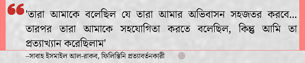 “অফিসার আমাকে হুমকি দেয়, বারবার হামাস ও আমার আত্মীয়দের সম্পর্কে জিজ্ঞাসা করে। যদি আমি বিশ্বাসযোগ্য উত্তর না দিই, আমাকে মারধরের হুমকি দেয়।”