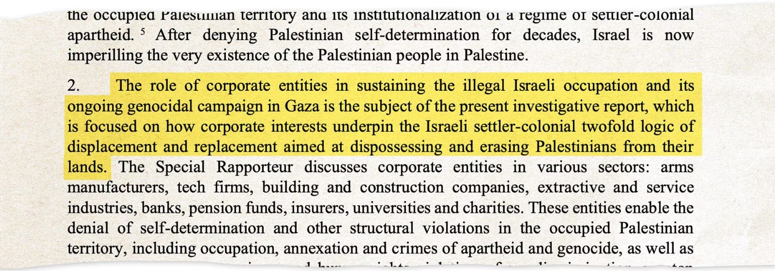 ২০২৫ সালের বসন্তে ফ্রান্সেসকা আলবানিজের লেখা “গোপনীয়” চিহ্নিত চিঠিগুলি আমেরিকার শীর্ষস্থানীয় কয়েকটি কোম্পানি এবং দুটি দাতব্য সংস্থার কাছে পাঠানো হয়। জাতিসংঘের ফিলিস্তিন বিষয়ক বিশেষ দূত হিসেবে আলবানিজ এই চিঠিগুলিতে সতর্ক করেছেন যে, তিনি শীঘ্রই গাজা এবং পশ্চিম তীরে ইসরায়েলের মানবাধিকারের গুরুতর লঙ্ঘনের জন্য জাতিসংঘের প্রতিবেদনে তাদের নাম উল্লেখ করতে পারেন।