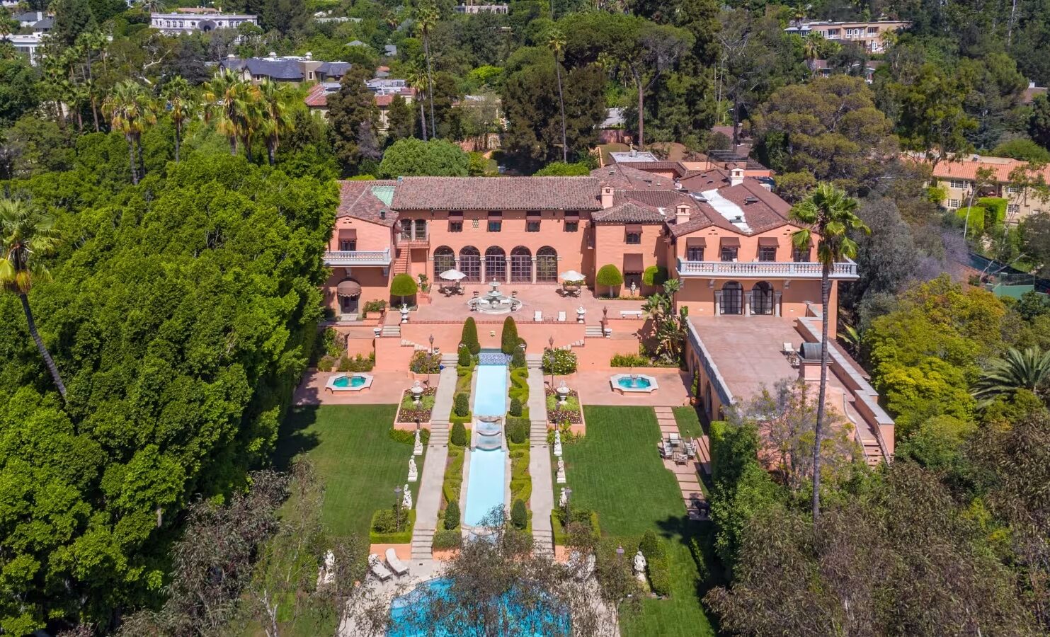 এস্টেটে রয়েছে ২২ ফুট উঁচু হাতে আঁকা সিলিং সহ নয়টি শয়নকক্ষবিশিষ্ট প্রধান বাড়ি, কাঠের তৈরি দ্বিতল লাইব্রেরি, আর্ট-ডেকো নাইটক্লাব এবং ১,০০০ জন অতিথির বিনোদনের জায়গা। এছাড়া পাঁচটি শয়নকক্ষবিশিষ্ট গেস্ট হাউস, স্টাফ অ্যাপার্টমেন্ট এবং একটি টেনিস প্যাভিলিয়নও আছে।