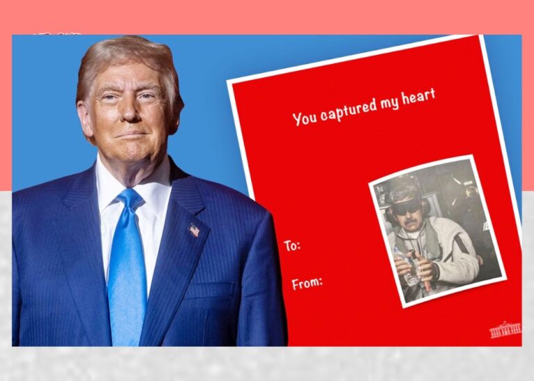 সোমবার সামাজিক যোগাযোগমাধ্যম এক্স–এ কয়েকটি ডিজিটাল কার্ড প্রকাশ করা হয়। একটি কার্ডে ভেনেজুয়েলা থেকে মাদুরোকে নিউইয়র্কে নিয়ে আসার সময়কার একটি ছবি ব্যবহার করা হয়েছে। সেখানে তাঁর চোখ বাঁধা এবং হাতে হাতকড়া দেখা যায়। কার্ডটিতে লেখা ছিল, ‘আপনি আমার হৃদয় হরণ করেছেন।’ ক্যাপশনে উল্লেখ করা হয়, ‘শুধু আপনার জন্য তৈরি করা।’