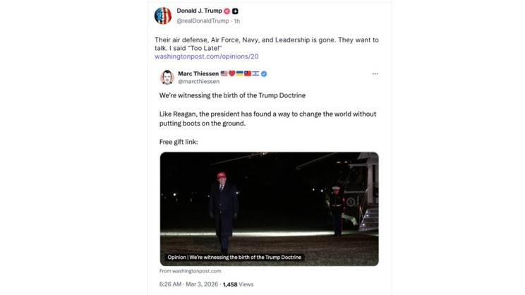 তিনি লিখেছেন, ‘তাদের বিমান প্রতিরক্ষা, বিমান বাহিনী, নৌবাহিনী এবং সামরিক নেতৃত্ব ধ্বংস হয়ে গেছে। তারা এখন কথা বলতে চায়। আমি বলেছি, খুব দেরি হয়ে গেছে।’