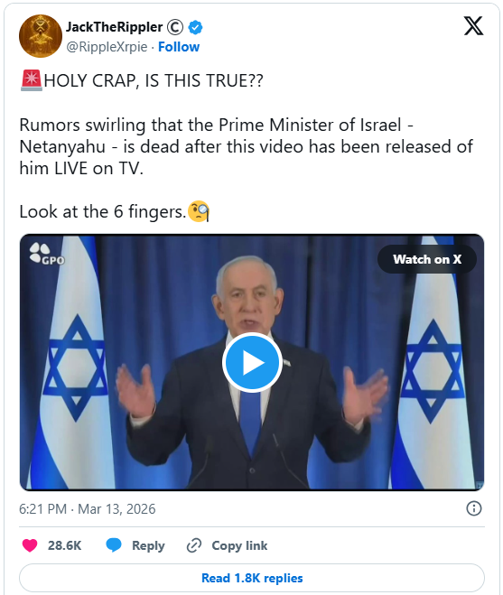 ইসরায়েলি প্রধানমন্ত্রী কি মারা গেছেন, নাকি বেঞ্জামিন নেতানিয়াহুর ছয়টি আঙুল আছে—এমন প্রশ্ন সোশ্যাল মিডিয়ায় ব্যাপক আলোচনার জন্ম দিয়েছে। ইসরায়েলি প্রধানমন্ত্রীর জাতির উদ্দেশ্যে দেওয়া একটি ভাষণের ভিডিও অনলাইনে ছড়িয়ে পড়ার পর এ নিয়ে নানা দাবি সামনে আসে।
