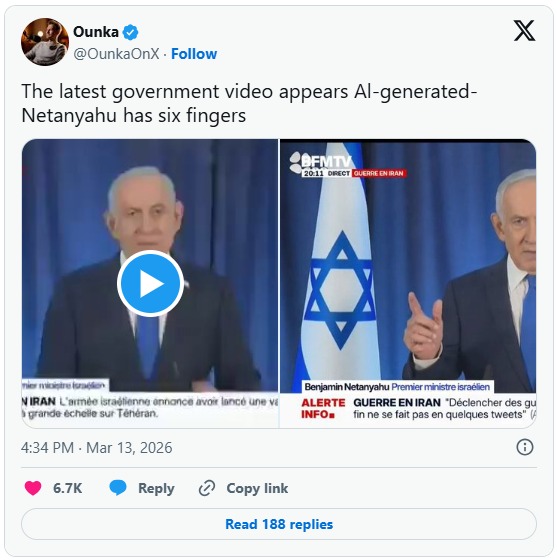 ইসরায়েলি প্রধানমন্ত্রীর জাতির উদ্দেশ্যে দেওয়া ভাষণের ভিডিও ভাইরাল হওয়ার পর সোশ্যাল মিডিয়ায় তার নিরাপত্তা ও অবস্থান নিয়ে ব্যাপক আলোচনা শুরু হয়। কিছু ব্যবহারকারী দাবি করেন, ভিডিওর একটি ফ্রেমে নেতানিয়াহুর হাতে ছয়টি আঙুল দেখা যাচ্ছে এবং সেটি এআই দিয়ে তৈরি বলে তারা ধারণা দেন।