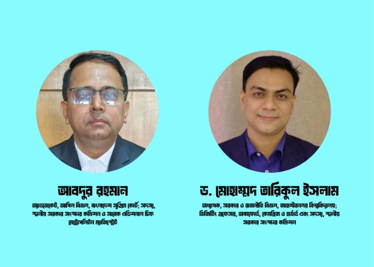 ড. মোহাম্মদ তারিকুল ইসলাম: অধ্যাপক, সরকার ও রাজনীতি বিভাগ, জাহাঙ্গীরনগর বিশ্ববিদ্যালয়; ভিজিটিং প্রফেসর, অক্সফোর্ড, কেমব্রিজ ও হার্ভার্ড এবং সদস্য, স্থানীয় সরকার সংস্কার কমিশন।