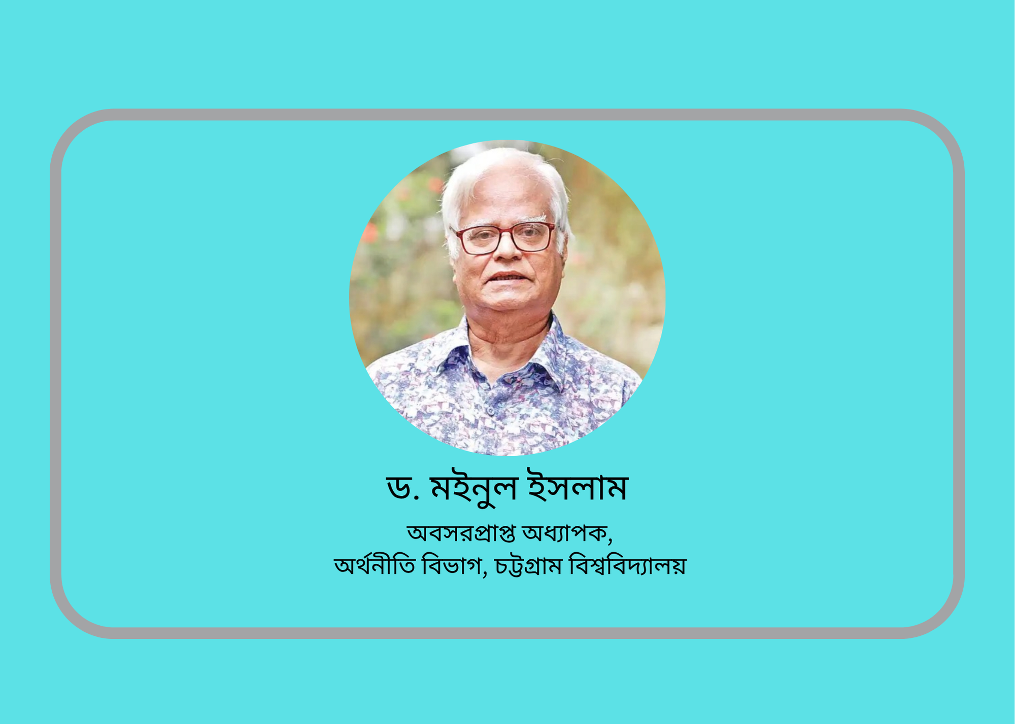ড. মইনুল ইসলাম: সাবেক সভাপতি, বাংলাদেশ অর্থনীতি সমিতি ও অবসরপ্রাপ্ত অধ্যাপক, অর্থনীতি বিভাগ, চট্টগ্রাম বিশ্ববিদ্যালয়। সূত্র: বনিক বার্তা
