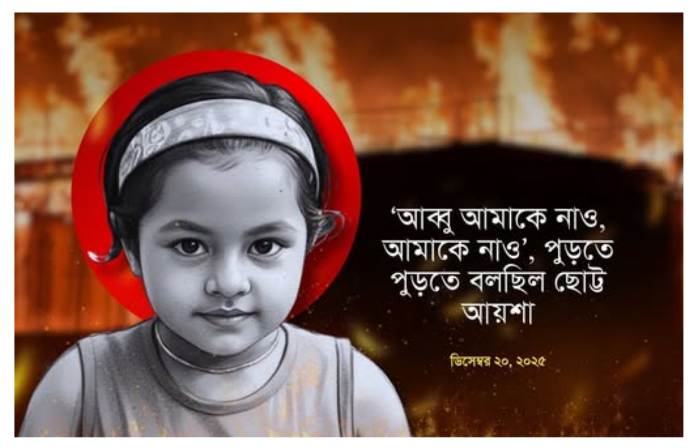 শুক্রবার গভীর রাতে লক্ষ্মীপুরের ভবানীগঞ্জ ইউনিয়নে বাইরে থেকে তালাবদ্ধ করে বিএনপির একজন স্থানীয় নেতার ঘরে পেট্রল ঢেলে আগুন দেয় দুর্বৃত্তরা। ঘরের বেড়া কেটে বড় দুই মেয়ে ও স্ত্রীকে নিয়ে বের হতে পারলেও, সাত বছরের শিশু আয়েশা আক্তার পুড়ে অঙ্গার হয়ে যায়। কী অপরাধ ছিল এই শিশুটির? মা ও বাবার চোখের সামনে পুড়ে মারা যায় আয়েশা। বাঁচার জন্য চিৎকার করলেও বাঁচানো যায়নি। এর থেকে বড় ট্র্যাজেডি, অসহায়ত্ব মানুষের আর কি হতে পারে!