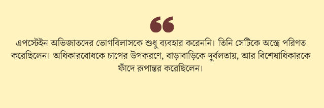 তাঁর জগতে প্রবেশের মানে ছিল একটি চিহ্ন পাওয়া। এমন এক বৃত্তে ঢোকা, যেখানে পরিণতির ভয় নেই। এপস্টেইন অভিজাতদের ভোগবিলাসকে শুধু ব্যবহার করেননি। তিনি সেটিকে অস্ত্রে পরিণত করেছিলেন। অধিকারবোধকে চাপের উপকরণে, বাড়াবাড়িকে দুর্বলতায়, আর বিশেষাধিকারকে ফাঁদে রূপান্তর করেছিলেন।