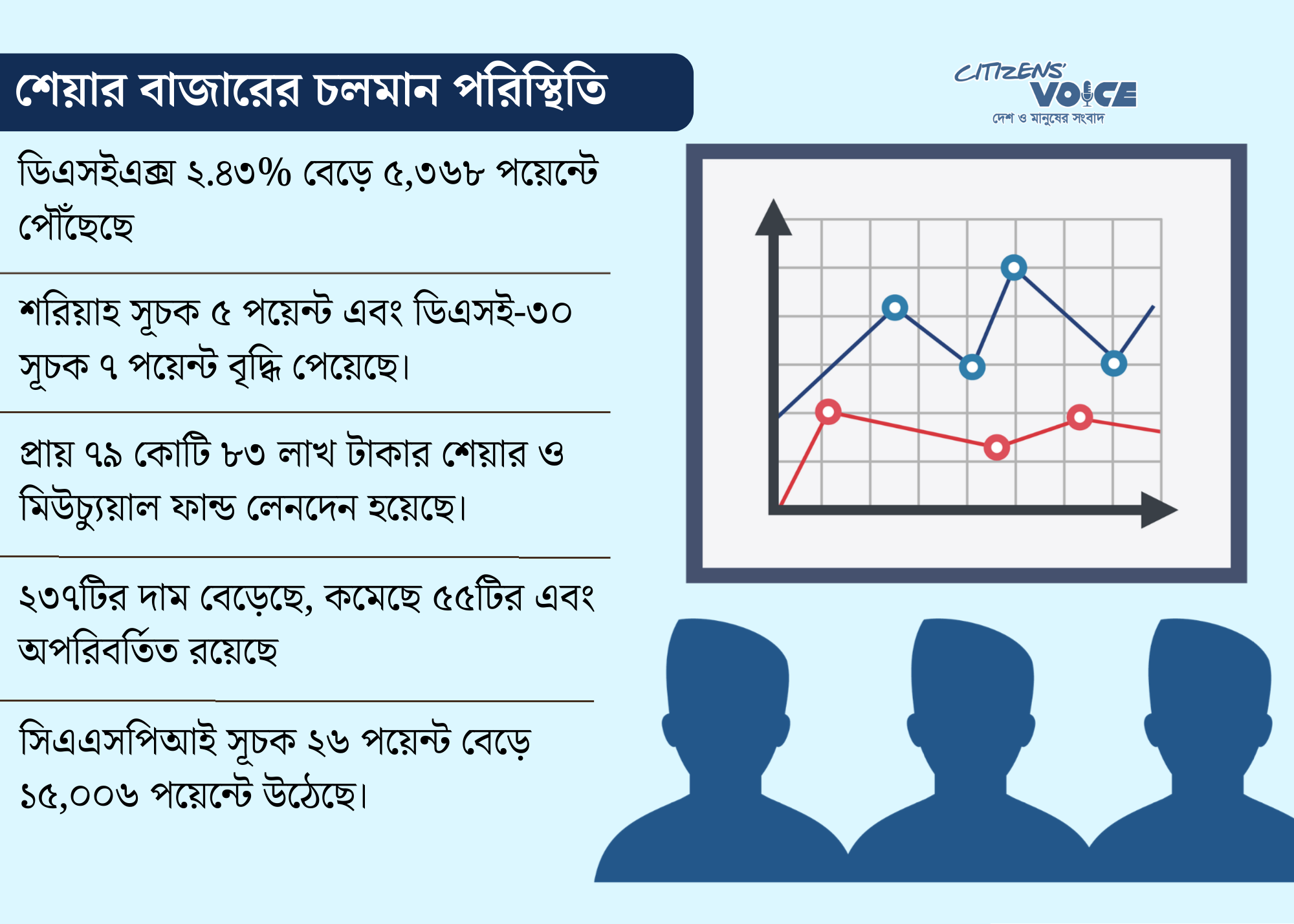 ডিএসই সূত্রে জানা যায়, সকাল সাড়ে ১০টার দিকে ডিএসইর সাধারণ সূচক ডিএসইএক্স আগের দিনের তুলনায় ৩০ পয়েন্ট বৃদ্ধি পেয়ে ৫,৩৪৯ পয়েন্টে পৌঁছায়। একই সময়ে শরীয়াহ সূচক ৫ পয়েন্ট এবং ডিএসই-৩০ সূচক ৭ পয়েন্ট বৃদ্ধি পেয়ে যথাক্রমে ১,০৭৬ ও ২,০৫০ পয়েন্টে অবস্থান করে।