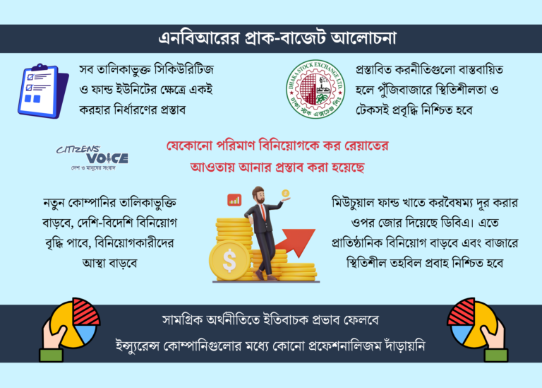 এদিকে, বাজেট-পূর্ব আলোচনায় জাতীয় রাজস্ব বোর্ড (এনবিআর)-এর চেয়ারম্যান মো. আবদুর রহমান খান বিমা খাতের নানা দুর্বলতার কথা তুলে ধরেন। তিনি বলেন, এই খাতে সুশাসন ও পেশাদারিত্বের ঘাটতি রয়েছে, যা গ্রাহকদের আস্থায় নেতিবাচক প্রভাব ফেলছে। তার মতে, অনেক বিমা কোম্পানি গ্রাহকদের প্রতিশ্রুতি পূরণে ব্যর্থ হচ্ছে। এমনকি মেয়াদ শেষে পাওনা অর্থ সময়মতো না দেওয়ার অভিযোগও রয়েছে। কর্মীদের অবসরকালীন সুবিধা না দেওয়ার ঘটনাও তিনি উল্লেখ করেন।