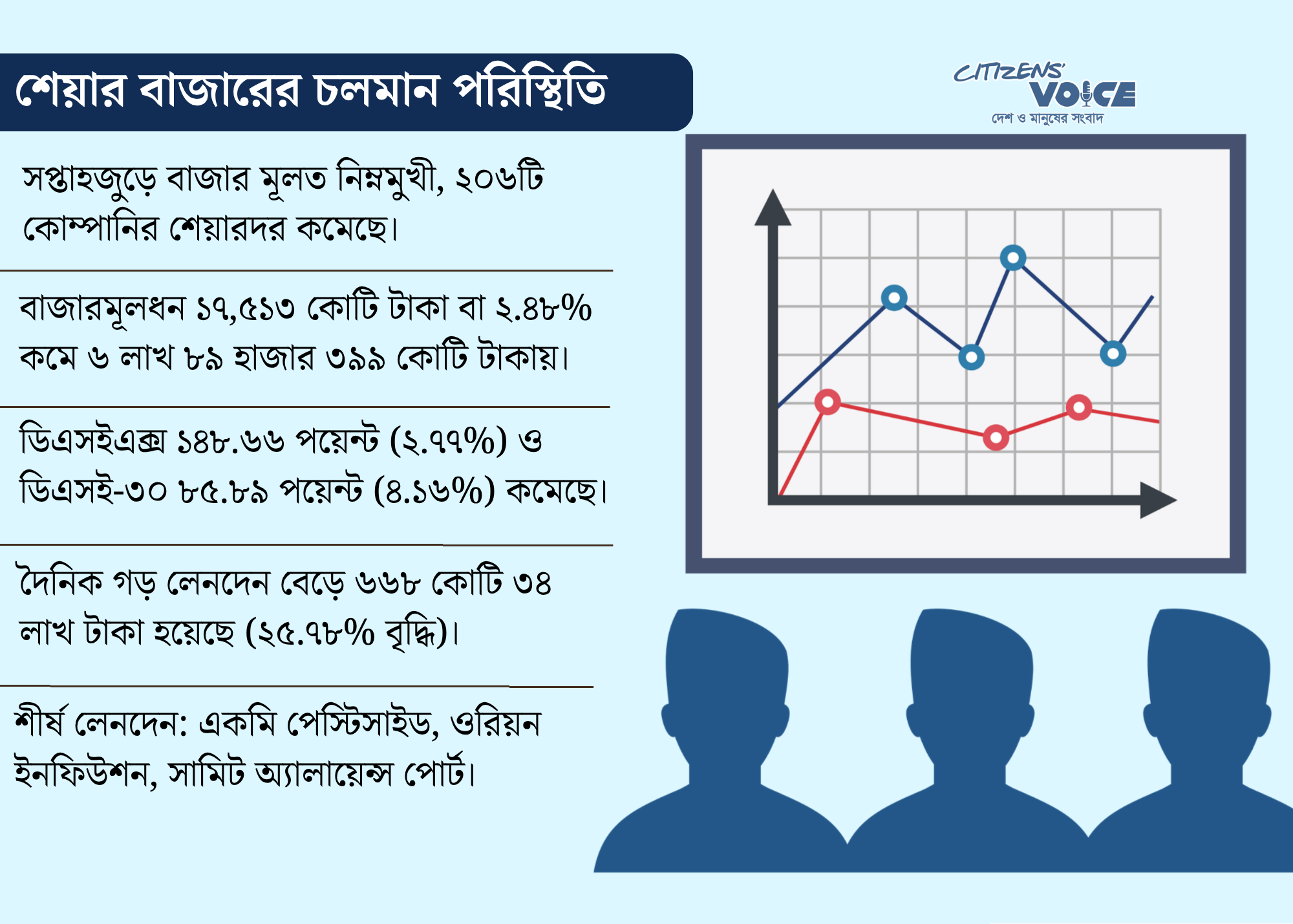 সপ্তাহজুড়ে বাজারে ক্রমাগত ওঠানামা দেখা যায়। প্রথম তিন কার্যদিবসে টানা পতন ঘটে। এরপর একদিন বাজার কিছুটা ঘুরে দাঁড়ালেও শেষ কার্যদিবসে আবারও বড় ধরনের দরপতন হয়। ফলে পুরো সপ্তাহে নিম্নমুখী প্রবণতাই প্রাধান্য পায়। লেনদেন হওয়া কোম্পানিগুলোর মধ্যে অধিকাংশের শেয়ারদর কমেছে। সপ্তাহে ২০৬টি প্রতিষ্ঠানের দরপতন হয়েছে। দর বেড়েছে ১৭২টি প্রতিষ্ঠানের এবং ১২টির দর অপরিবর্তিত ছিল।