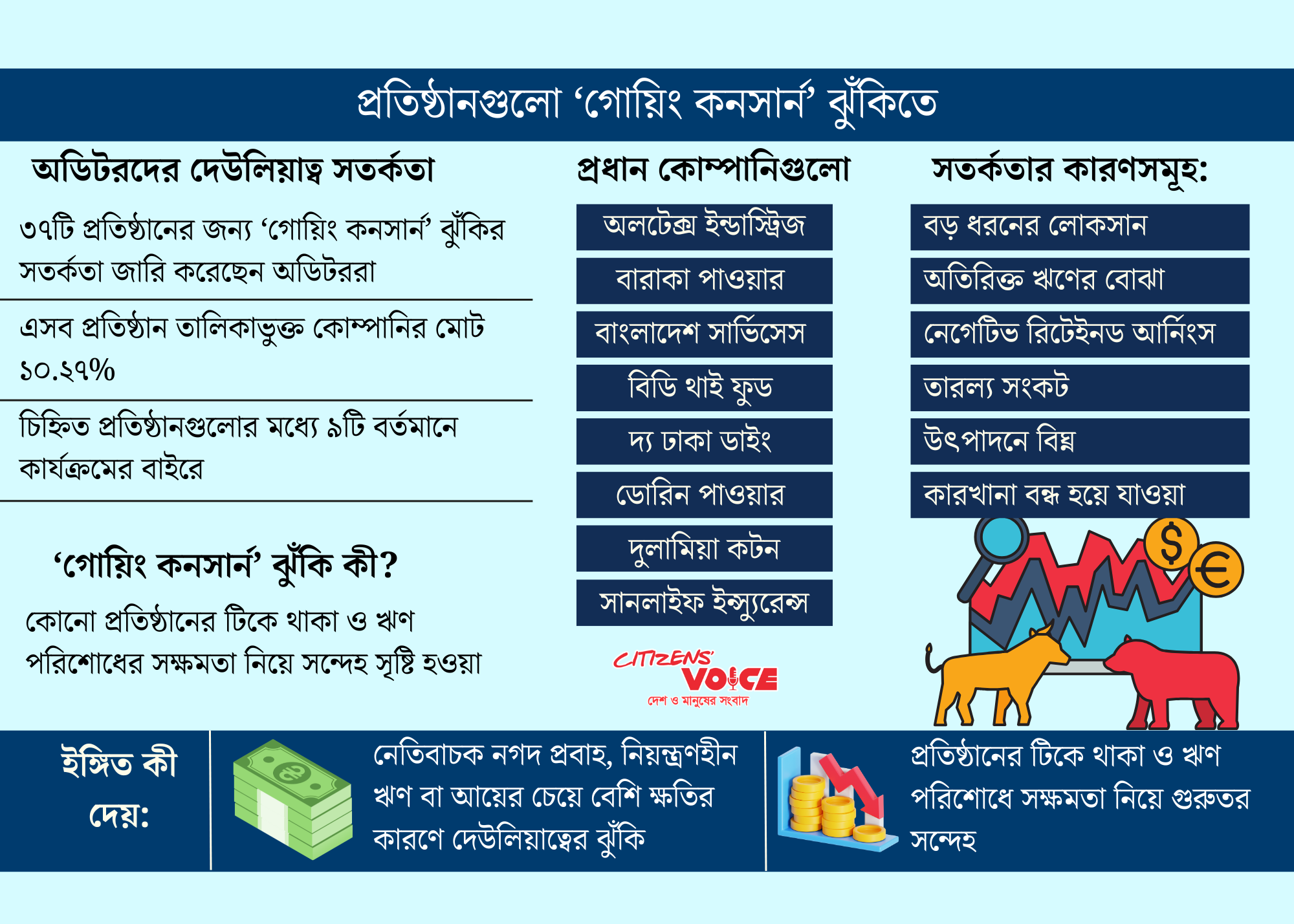 ঢাকা স্টক এক্সচেঞ্জ (ডিএসই)-এর তথ্য অনুযায়ী, এই ৩৭টি কোম্পানি মোট তালিকাভুক্ত প্রতিষ্ঠানের ১০ শতাংশেরও বেশি। ফলে সমস্যার ব্যাপ্তি বড় আকারে দেখা দিয়েছে। অডিট প্রতিবেদনে “গোয়িং কনসার্ন” উল্লেখ থাকলে বোঝায়, সংশ্লিষ্ট কোম্পানির ভবিষ্যতে ব্যবসা চালিয়ে যাওয়ার সক্ষমতা নিয়ে গুরুতর সন্দেহ রয়েছে। সাধারণত ধারাবাহিক লোকসান, ঋণের চাপ, তারল্য সংকট বা কার্যক্রমে স্থবিরতা থাকলে এ ধরনের সতর্কতা দেওয়া হয়।