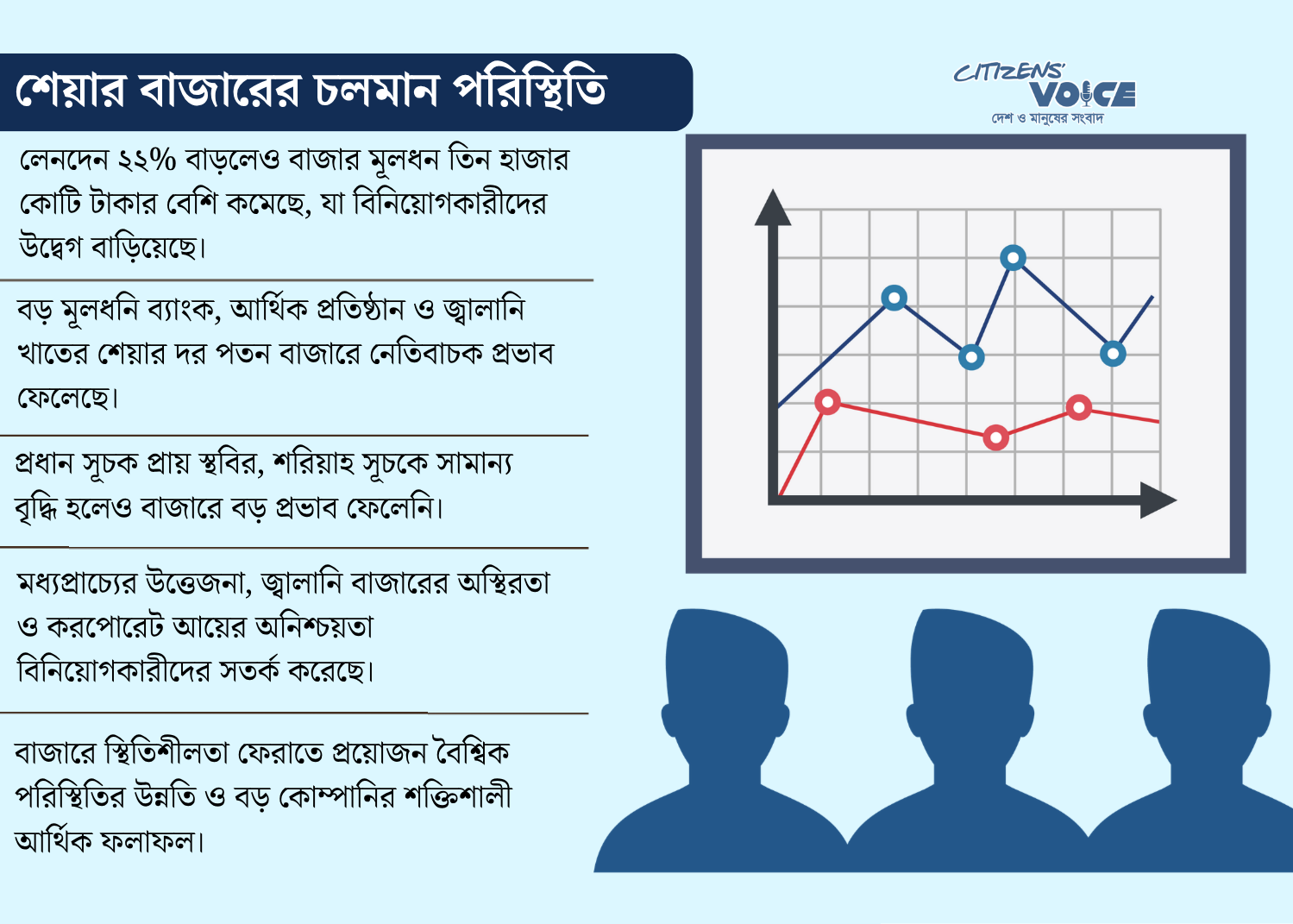মধ্যপ্রাচ্যের ভূরাজনৈতিক উত্তেজনা ও বৈশ্বিক অর্থনৈতিক অনিশ্চয়তার প্রভাব দেশের পুঁজিবাজারে এখনো স্পষ্টভাবে অনুভূত হচ্ছে। গত সপ্তাহে লেনদেনে উল্লম্ফন দেখা গেলেও বাজার মূলধনে উল্লেখযোগ্য পতন বিনিয়োগকারীদের মধ্যে নতুন করে উদ্বেগ তৈরি করেছে।