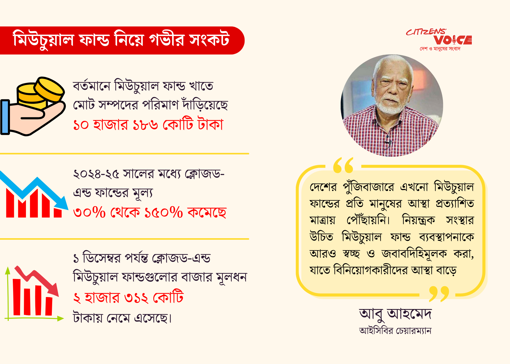 বর্তমানে মিউচুয়াল ফান্ড খাতে মোট সম্পদের পরিমাণ ১০ হাজার ১৮৬ কোটি টাকা। এর মধ্যে ক্লোজড-এন্ড ফান্ডের অংশ ৪ হাজার ৮১০ কোটি টাকা এবং ওপেন-এন্ড ফান্ডের অংশ ৫ হাজার ৩৭৬ কোটি টাকা। শেয়ারবাজারে তালিকাভুক্ত ৩৭টি ক্লোজড-এন্ড ফান্ডের মধ্যে ৩৫টি তাদের নিট সম্পদ মূল্যের (এনএভি) চেয়ে কম দামে লেনদেন হচ্ছে। ৩৩টি তাদের ফেস ভ্যালু বা অভিহিত মূল্যের চেয়ে কম দামে বিক্রি হচ্ছে। ২০২৪ থেকে ২০২৫ সালের মধ্যে প্রতিটি ক্লোজড-এন্ড ফান্ডের মূল্য ৩০ থেকে ১৫০ শতাংশ কমেছে। ১ ডিসেম্বর পর্যন্ত ক্লোজড-এন্ড ফান্ডগুলোর বাজার মূলধন ২ হাজার ৩১২ কোটি টাকায় নেমে এসেছে। ক্ষুদ্র বিনিয়োগকারীরা পেশাগতভাবে পরিচালিত স্থিতিশীল রিটার্নের আশা করেছিলেন। কিন্তু তারা এখন এনএভি হ্রাস, দুর্বল ডিভিডেন্ড রেকর্ড এবং অনিয়মের মুখোমুখি। ইউনিট হোল্ডাররা লোকসান বহন করলেও অ্যাসেট ম্যানেজাররা ফি গ্রহণ চালিয়ে যাচ্ছেন।