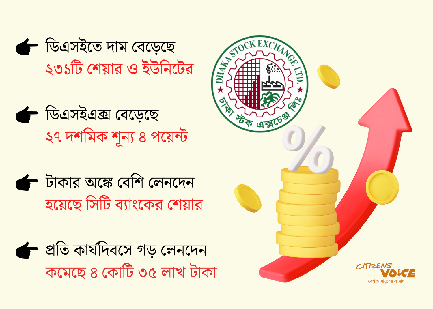 গত সপ্তাহে দেশের শেয়ারবাজারে সূচকের ঊর্ধ্বগতি বিনিয়োগকারীদের মধ্যে কিছুটা হলেও স্বস্তির বার্তা দিয়েছে। পুরো সপ্তাহজুড়ে দরপতনের তুলনায় দরবৃদ্ধির তালিকায় থাকা প্রতিষ্ঠানের সংখ্যা ছিল দ্বিগুণেরও বেশি। এর প্রভাবে দেশের প্রধান শেয়ারবাজার ঢাকা স্টক এক্সচেঞ্জে (ডিএসই) বাজার মূলধন প্রায় ৪ হাজার কোটি টাকা বেড়েছে এবং প্রধান সূচকও ঊর্ধ্বমুখী হয়েছে। তবে ইতিবাচক এই চিত্রের মাঝেও লেনদেনের গতি কিছুটা কমেছে।