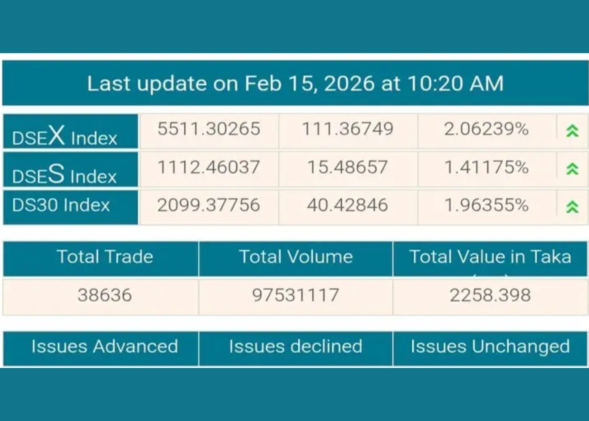 ডিএসই পর্যালোচনায় দেখা গেছে, রোববার লেনদেন শুরু হতেই প্রায় সব প্রতিষ্ঠানই দাম বাড়িয়েছে। সূচক লেনদেনের পাঁচ মিনিটের মধ্যে ১৫৬ পয়েন্ট বেড়ে যায়। তবে পরবর্তী সময়ে কিছু প্রতিষ্ঠানের দাম বাড়ার গতি ধীর হয়। ১০টা ২০ মিনিট পর্যন্ত ৩৫২টি প্রতিষ্ঠানের শেয়ার ও ইউনিটের দাম বেড়েছে, ১৫টির দাম কমেছে এবং ১৩টির দাম অপরিবর্তিত রয়েছে। এর ফলে ডিএসইএক্স সূচক ১১১ পয়েন্ট বেড়েছে। অপর দুই সূচক হলো: ডিএসই-৩০ সূচক ৪০ পয়েন্ট এবং ডিএসই শরিয়াহ্ সূচক ১৫ পয়েন্ট বৃদ্ধি পেয়েছে। এ সময় লেনদেন হয়েছে ২২৫ কোটি ৮৩ লাখ টাকা।
